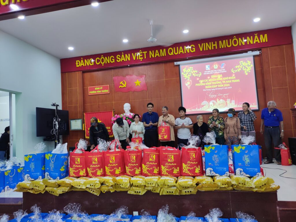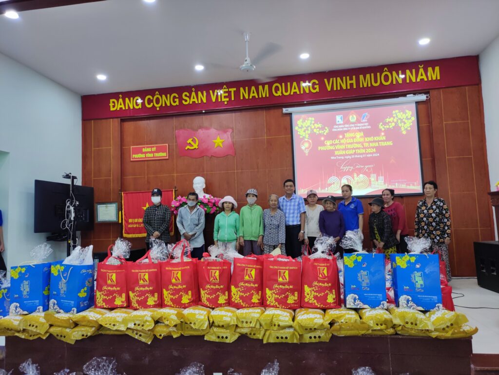 Sáng ngày 20/01/2024, Công đoàn Tổng Công ty Khánh Việt phối hợp với Công đoàn cơ sở Công ty Cổ phần In bao bì Khatoco và UBND phường Vĩnh Trường (TP. Nha Trang) tổ chức chương trình tặng quà Tết Nguyên đán Giáp Thìn 2024 cho hộ nghèo, cận nghèo, hộ có hoàn cảnh khó khăn trên địa bàn phường Vĩnh Trường.