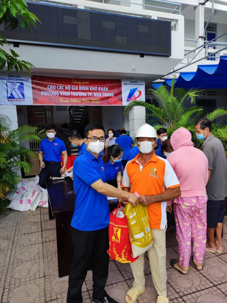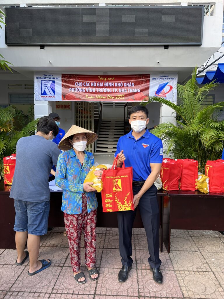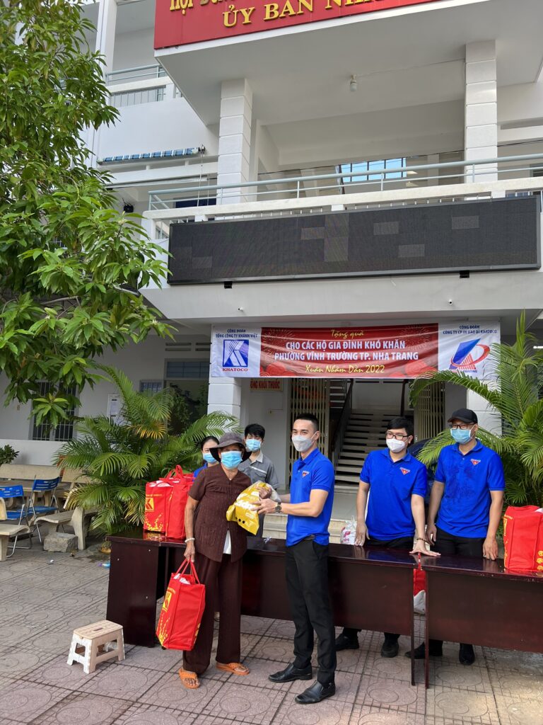Nhân dịp Tết Nguyên đán Xuân Nhâm Dần 2022, sáng ngày 19/01/2022, Công đoàn Công ty Cổ phần In Bao bì Khatoco phối hợp với Đoàn thanh niên đã tổ chức chương trình tặng quà cho các hộ gia đình khó khăn tại phường Vĩnh Trường, thành phố Nha Trang. Đây là một chương trình thường niên của Công ty tại địa phương với mong muốn chia sẻ một phần khó khăn với người dân tại địa phương nơi đơn vị đóng quân và mang đến một không khí ấm áp cho mọi người nhân dịp xuân về.