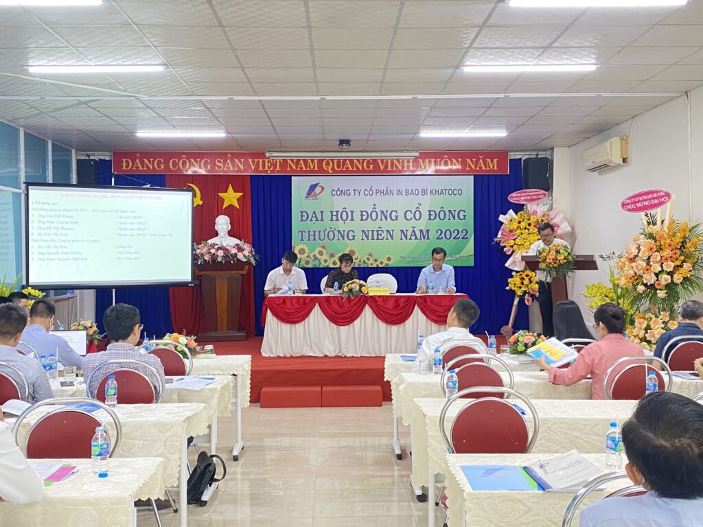 Sáng ngày 28/4/2022, Công ty Cổ phần In Bao bì Khatoco đã tổ chức Đại hội đồng cổ đông năm 2022 tại hội trường công ty In Bao Bì Khatoco . Đến tham dự đại hội có ông Cao Thế Khang – Chủ tịch Hội đồng Quản trị Công ty Cổ phần In Bao bì Khatoco (HĐQT), cùng các thành viên trong HĐQT, Ban kiểm soát, Ban điều hành và các cổ đông của Công ty Cổ phần In bao bì Khatoco.