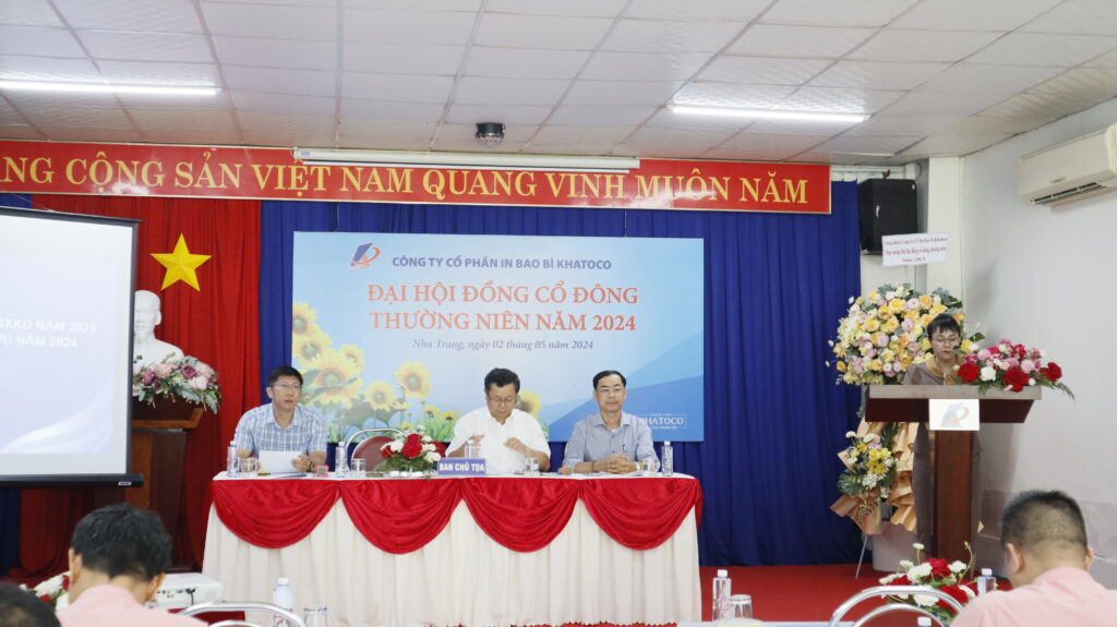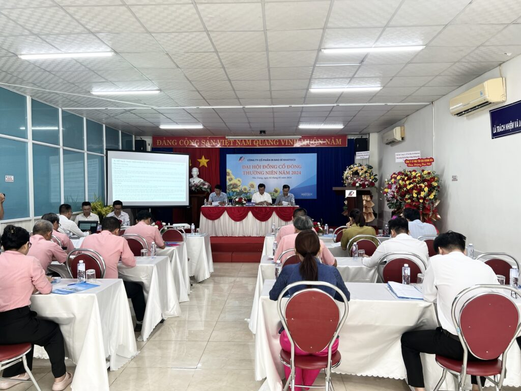Sáng ngày 02/05/2024, Công ty Cổ phần In Bao bì Khatoco đã tổ chức thành công Đại hội đồng cổ đông thường niên năm 2024 tại hội trường Công ty. Đến tham dự Đại hội có ông Cao Thế Khang – Chủ tịch Hội đồng Quản trị Công ty, cùng các thành viên trong Hội đồng Quản trị, Ban kiểm soát, Ban Điều hành và các cổ đông của Công ty Cổ phần In bao bì Khatoco.