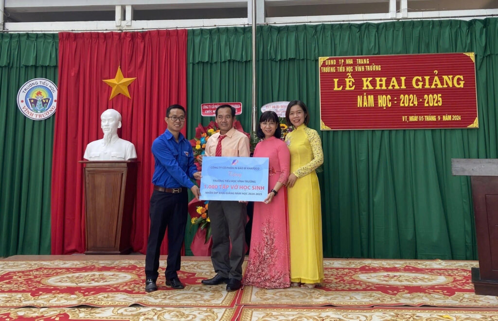 Theo đó, Ban chấp hành Chi đoàn đã trao tặng 1.000 quyển vở cho học sinh có hoàn cảnh khó khăn và 20 suất quà gồm cặp xách và bộ dụng cụ học tập cho học sinh nghèo vượt khó của Trường tiểu học Vĩnh Trường. Tổng giá trị các phần quà là 13 triệu đồng, được trích từ nguồn kinh phí Công đoàn cơ sở Công ty Cổ phần In bao bì Khatoco. Đây là hoạt động có ý nghĩa nhân văn sâu sắc, không chỉ hỗ trợ vật chất mà còn động viên tinh thần học tập cho các em học sinh trong những ngày đầu bước vào năm học mới.