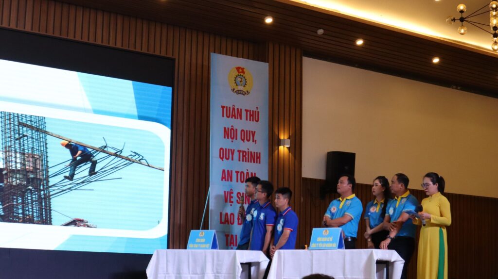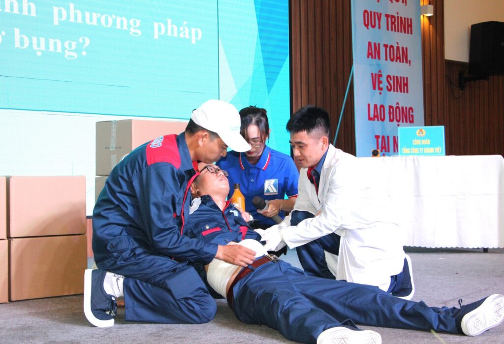 Hội thi có 19 đội đến từ các Công đoàn thành phố, huyện, ngành trực thuộc Liên đoàn Lao động tỉnh Khánh Hoà. Các đội tham gia tranh tài 3 phần thi: Chào hỏi, kiến thức về an toàn, vệ sinh lao động (ATVSLĐ), thao tác thực hành. Trong đó, ở phần thi chào hỏi, trong thời gian 5 phút, đội Công đoàn Tổng công ty Khánh Việt đã mang đến một tiết mục vô cùng đặc sắc được thể hiện bằng hình thức hát, múa giới thiệu về đơn vị và hoạt động ATVSLĐ tại đơn vị, kết hợp với tiểu phẩm ngắn về tình huống xử lý trong công tác phòng chống cháy nổ. Với phần thi kiến thức về ATVSLĐ, đội đã xuất sắc trả lời đúng 4 câu hỏi bằng hình thức trắc nghiệm và xử lý 1 tình huống nguy cơ gây tai nạn lao động, bệnh nghề nghiệp, cháy nổ trong sản xuất. Đối với phần thi thực hành, bằng các thao tác nhuần nhuyễn và khéo léo, đội nhanh chóng tiến hành sơ cấp cứu tình huống nạn nhân bị lòi ruột ở bụng do tai nạn lao động, được Ban giám khảo đánh giá cao.