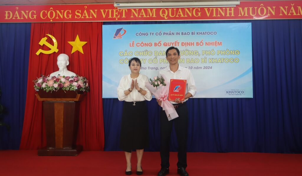 Nhằm kiện toàn đội ngũ nhân sự quản lý, vào chiều ngày 30/10/2024, Công ty Cổ phần In bao bì Khatoco đã long trọng tổ chức lễ công bố quyết định bổ nhiệm các chức danh Trưởng, Phó phòng với sự tham dự của bà Trần Thị Hoài – Bí thư Chi bộ, Giám đốc Công ty cùng các thành viên trong Ban Giám đốc và đội ngũ cán bộ quản lý của Công ty.