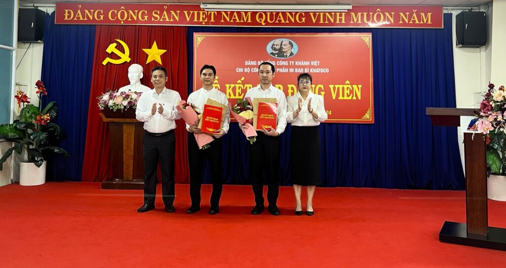 Chiều ngày 07/12/2024, tại Hội trường Công ty Cổ phần In bao bì Khatoco, Chi bộ Công ty đã long trọng tổ chức Lễ kết nạp Đảng viên mới cho hai quần chúng ưu tú là đồng chí Huỳnh Tấn Thành – nhân viên phòng Kinh doanh và đồng chí Phan Gia Hòa – công nhân Phân xưởng Cơ sở 2, Ủy viên Ban Chấp hành Đoàn Thanh niên.