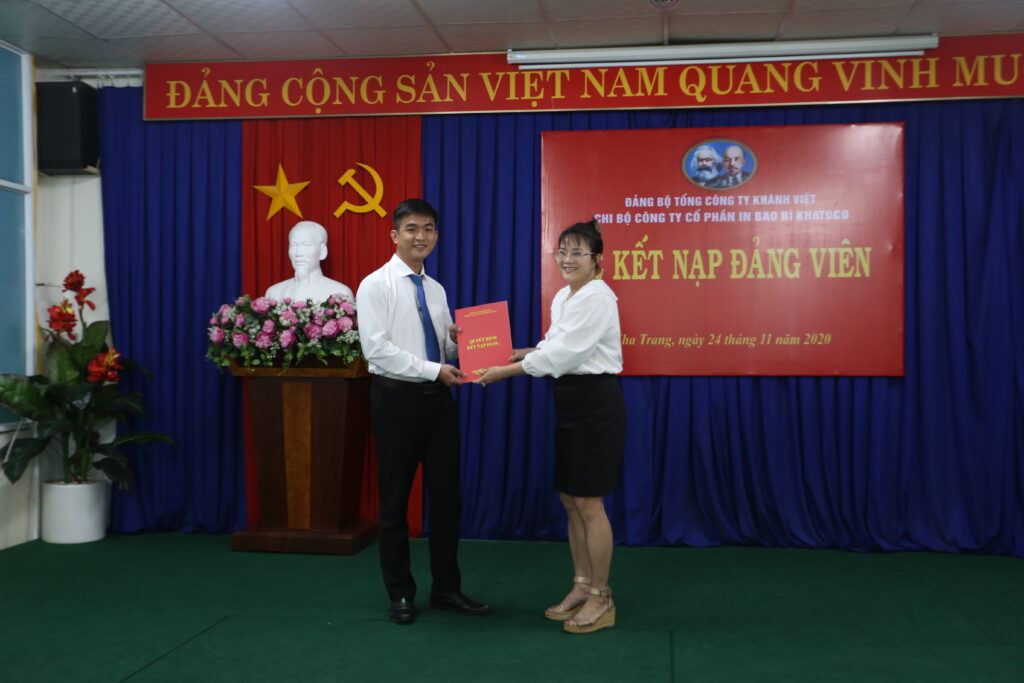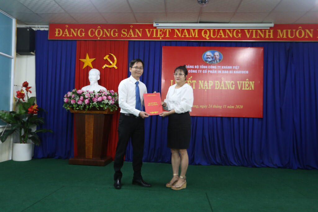 Chiều ngày 24/11/2020, Chi bộ Công ty Cổ phần In Bao bì Khatoco thuộc Đảng bộ Tổng Công ty Khánh Việt đã tổ chức Lễ kết nạp đảng viên cho quần chúng ưu tú Phạm Nguyễn Việt Anh – Phụ trách Phòng Công nghệ Chế bản và Trần Ngọc Quang – Nhân viên Kế toán.